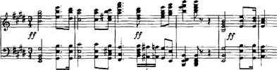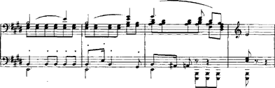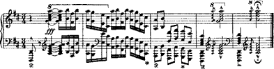Das Zerlina-Thema verschwindet aber schon nach zwölf Takten wieder, und nach einigen virtuosen Eskapaden setzt Thalberg zur Reprise seines eigenen Themas (Beispiel 2) an. Nachdem er dieses mit Ketten von Tonrepetitionen über die halbe Klaviatur garniert hat, lässt er es in einer Weise kulminieren, die glauben macht, die "Don Giovanni"-Fantasie käme zu ihrem Ende, bevor sie überhaupt richtig begonnen hat. Just an dieser Stelle meldet sich nun erstmals das Menuett-Thema zu Wort ziemlich unauffällig als Mittelstimme (Beispiel 6).