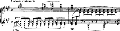 Doch weniger dieser formale Aspekt soll uns hier beschäftigen als die Frage, ob es auch inhaltlich eine Verknüpfung gibt. Gehen wir von hinten von der Coda aus: dort gibt es eine Motivverknüpfung, die in Bizets Oper nicht vorkommt. In diesem "Andante visionario" kombiniert Busoni eine chromatische Abwärtsbewegung in der linken Hand mit einem durch die übermässige Sekunde geprägten Motiv in der rechten (Beispiel 13).