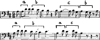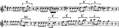 Während die Variationen über die beiden Themen konventionell und höchstens unter dem Aspekt des Klaviersatzes von Interesse sind, verdient die aussergewöhnlich umfangreiche Einleitung eine genauere Betrachtung, weil es sich hier um mehr handelt als blosses Präludieren. Denn ganz beziehungslos zu "Don Giovanni" sind diese fast 150 Takte nicht: So wie sich unter den Kleidern Leporellos Don Giovanni verbirgt und die signore maschere sich als das adlige Trio Anna/Elvira/Ottavio entpuppen, lassen sich nämlich unter der Thalberg-Melodik die entsprechenden Mozart-Themen ausfindig machen. Die Folge Dominantton-Grundton-Dominantton; von der Thalberg ausgeht (Beispiel 2, Klammer a), entspricht der markanten Quartbewegung im zweiten Takt des Mozart-Menuetts besonders markant deshalb, weil die Quarte auf eine Reihe von Tonwiederholungen folgt und im ganzen Thema der grösste Schritt bleibt (Beispiel 7, a).