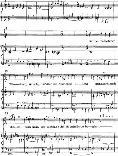 Es war also nicht bloss eine Verlegenheitslösung, ein Zurückgreifen auf den Fundus aus Gründen der Bequemlichkeit, wenn Eisler hier ein Klavierstück zu einer Arie umarbeitete. Denn das Klavierstück bietet genau das Motivmaterial, welches er für seine dialektische Vertonung des Arientextes brauchte. Der erste Takt exponiert die Tonrepetitionen, der zweite die Chromatik. Die Chromatik setzt den Gestus des Textes direkt um, die Repetitionen fügen ihm eine Dimension zu oder setzen gar ein Gegengewicht und gerade das zeichnet Eislers Textvertonung aus: dass die Musik ihren eigenen, über den Text hinausgehenden Sinn hat. Und dass sie auch strukturell ihren eigenen Sinn hat, ist hier eine tautologische Feststellung, da die Arie ja von einem Klavierstück ausgeht.